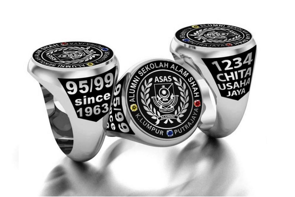Cincin rekaan khas ini menampilkan tulisan Alumni Sekolah Alam Shah dan logo rasmi ASAS sebagai elemen fokal. Ia dihiasi tiga batu permata yang melambangkan warna tema sekolah (kuning, biru, dan merah) menjadikannya simbol kebanggaan dan semangat kesatuan warga ASAS. Pada sisi cincin, terdapat tahun batch anda bersama tahun bermulanya sejarah sekolah, manakala di sisi yang lain pula terukir nombor unik setiap Ahli ASAS serta moto CHITA USAHA JAYA.